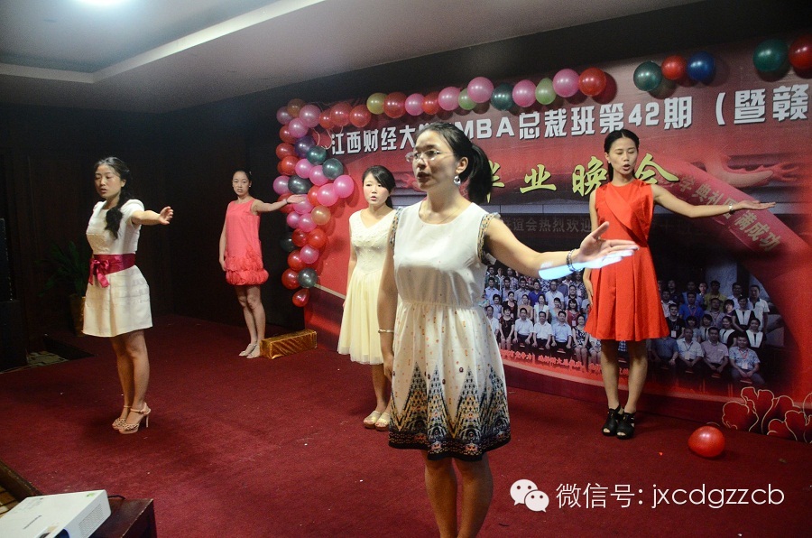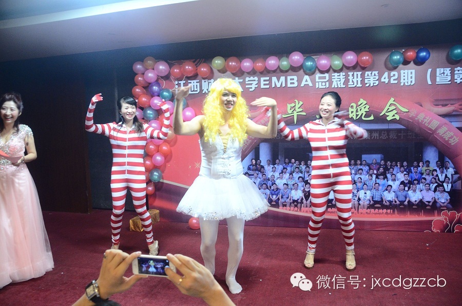 晚上七时许,伴随着激昂的音乐,主持人袁满香、赖岗辉闪亮登台,宣布毕业晚会正式开始。EDP中心的老师们带来的《感恩的心》手语舞蹈给毕业学员们送上了深深的祝福,并拉开了晚会的序幕。《同桌的你》歌舞表演,表达了同学间深深的不舍之情;今年红遍大江南北的《小苹果》,在十班同学的反串和激情下,赢得在场同学们阵阵掌声和尖叫声;由班长康冬青创作并朗诵的诗歌《时间都去哪儿了》唤起了同学们一年总裁班学习的各种场景;歌舞表演《红军阿哥你慢慢走》《酒神曲》则一次次的将晚会推向高潮;由十班男女同学精彩呈现的时装秀则引发同学们争先拍照合影留念......同学们通过各种精心准备、内容丰富的节目表达心中的感激与不舍之情。晚会期间,在照片展示下,由班主任李华荣老师给大家做了十班一年学习回顾,一张张学员上课、活动的欢声笑语的照片,让大家仿佛还回到了曾经的过往点滴,与会的师生都感慨时光走的是那么的快;全班同学一同为8月份过生日的同学一起过生日;学员间还通过气球抽签来互赠纪念品,给彼此留下