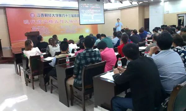 2014年10月16日江西财经大学第63届高管论坛走进我们美丽的鹰潭。在这个秋阳普照的日子里,我们很荣幸地邀请到了清华、北大特聘主讲教授,建策软动团队发起人及首席合伙人,中国对外经济贸易大学特约研究员,深圳大学中英合作项目剑桥商务课程主讲,深圳市政府"事改企"专家组成员翟万宝教授就《现代商业模式与人脉资源整合》课程和鹰潭的各界精英们进行精彩的学习分享。此次论坛安排在鹰潭市月湖区地税局三楼会议室,其顺利召开也得到了鹰潭、月湖、贵溪、余江工商联、民建企业家联谊会、鹰潭市地税局、月湖区地税局和鹰潭天芝鸿装饰建材有限公司的大力支持。在省内外各界两百多位精英的热烈响应下,翟教授以生动幽默的授课方式,并结合大量现实的案例将自己几十年总结的经典理论娓娓道来,讲述了人脉资源整合在当今经济社会的重要性及自己对商业模式创新的独到见解。论坛一整天下来会议室都座无虚席,来宾们课堂上积极与翟老师互动,论坛现场掌声不断,赢得了各界人士的一致好评。
